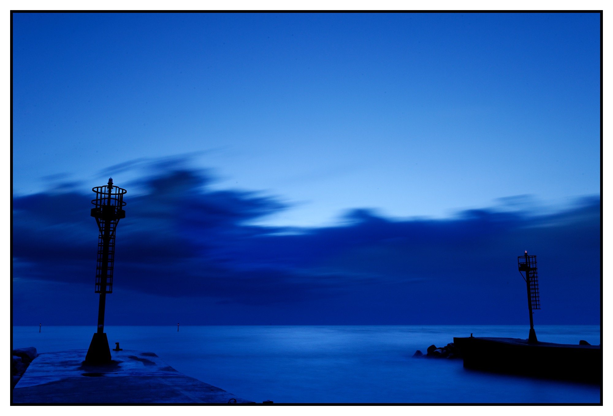 Nessun peschereccio di ritorno. Un paio di bottiglie vuote, nascoste alla base del faro, guardano il profilo sartoriale del mare vestirsi di morbido e pregiato cachemire blu. Pare che la notte per osmosi abbia ceduto colore alle lusinghe dell’acqua. Canto senza timore di essere catturato dalle reti poiché ancora, per le cicale di mare, non è stagione di pesca. Provincia di Ravenna, Cervia. Alta moda, la mattina.