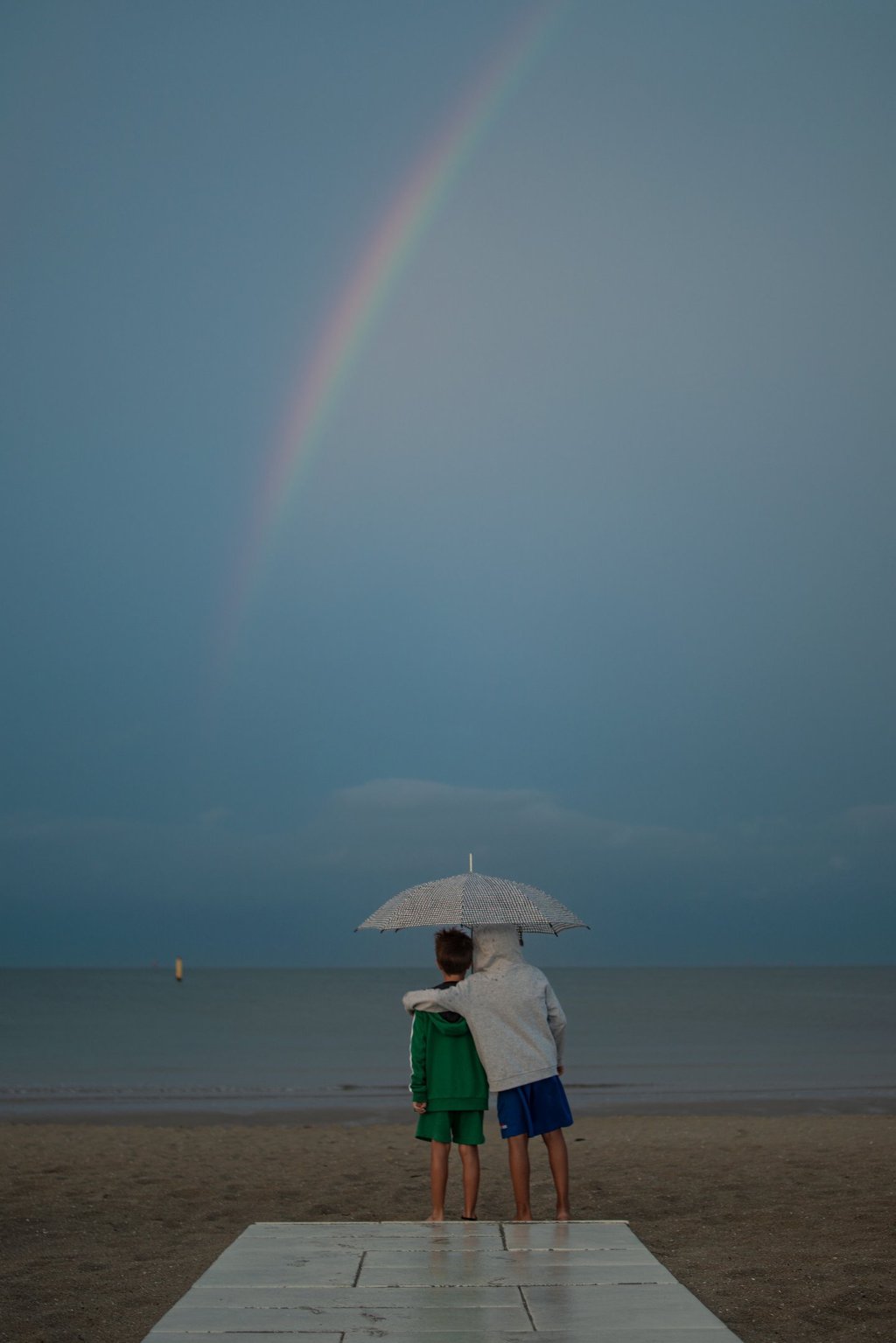 Poteva gustarsi lo spettro di luce comodamente seduto al riparo, con il naso affogato in un cono gelato. Ma troppo forte fu il desiderio di spezzare in due l’arcobaleno e ricomporlo in un abbraccio. Una mano sulla spalla a riscaldare uno spigolo di cuore, l’altra a farsi scudo contro le gocce così pesanti da confondersi in chiodi... mentre i piedi divennero tozzi di pane navigati in un cappuccino di mare. “Che importa se mi cola il naso. Non ho preso freddo, è che a dire il vero, starti vicino mi commuove a tal punto da credere che, bucato il cielo, oltre, ci sia davvero l’eternità.”